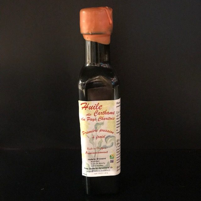 Huile issue des graines de carthame. La carthame est une sorte de chardon, le chardon fleuri bleu alors que la carthame fleurie rouge/orange. Elle s’utilise pour l’assaisonnement à froid et elle a une légère saveur d’artichaut. Elle peut aussi s’utiliser pour les macérats huileux. Elle est riche en Oméga 6.