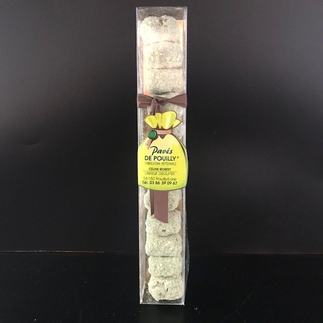 C’est un bonbon de chocolat contenant du praliné noisette entre 2 feuilles de nougatines (sucre, amandes hachées) enrobé de poudre d’amande.